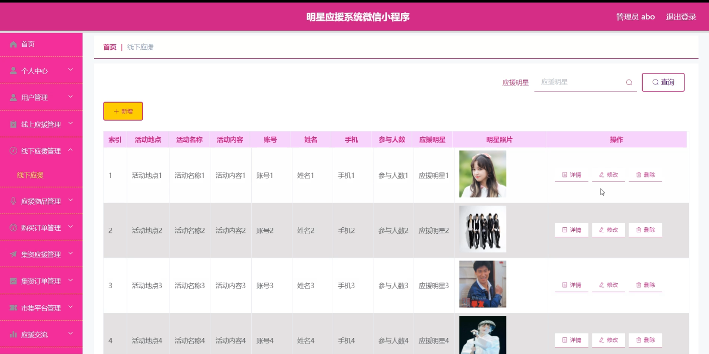 本基于微信小程序的明星应援系统有管理员和用户两个角色。
