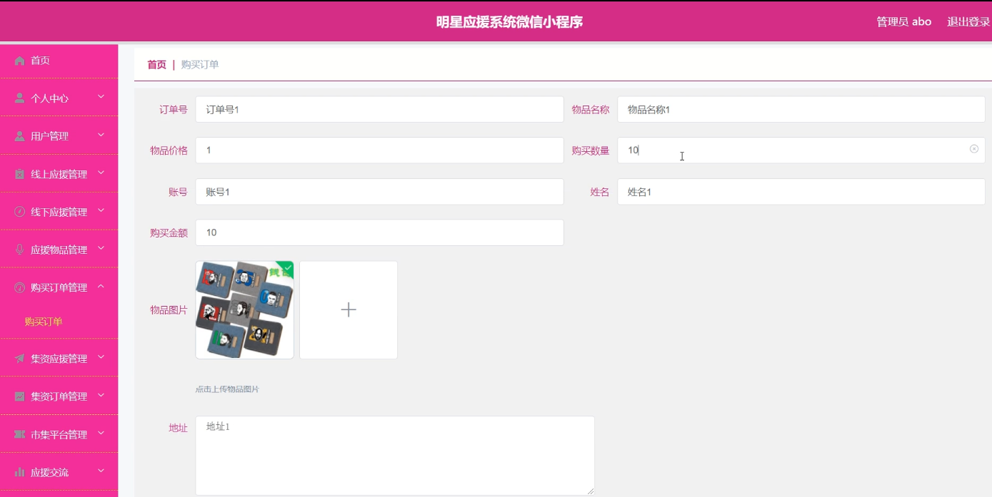 管理员功能有个人中心,用户管理,线上应援管理,线下应援管理,应援物品管理,购买订单管理,集资应援管理,集资订单管理,市集平台管理,应援交流管理,系统管理等。