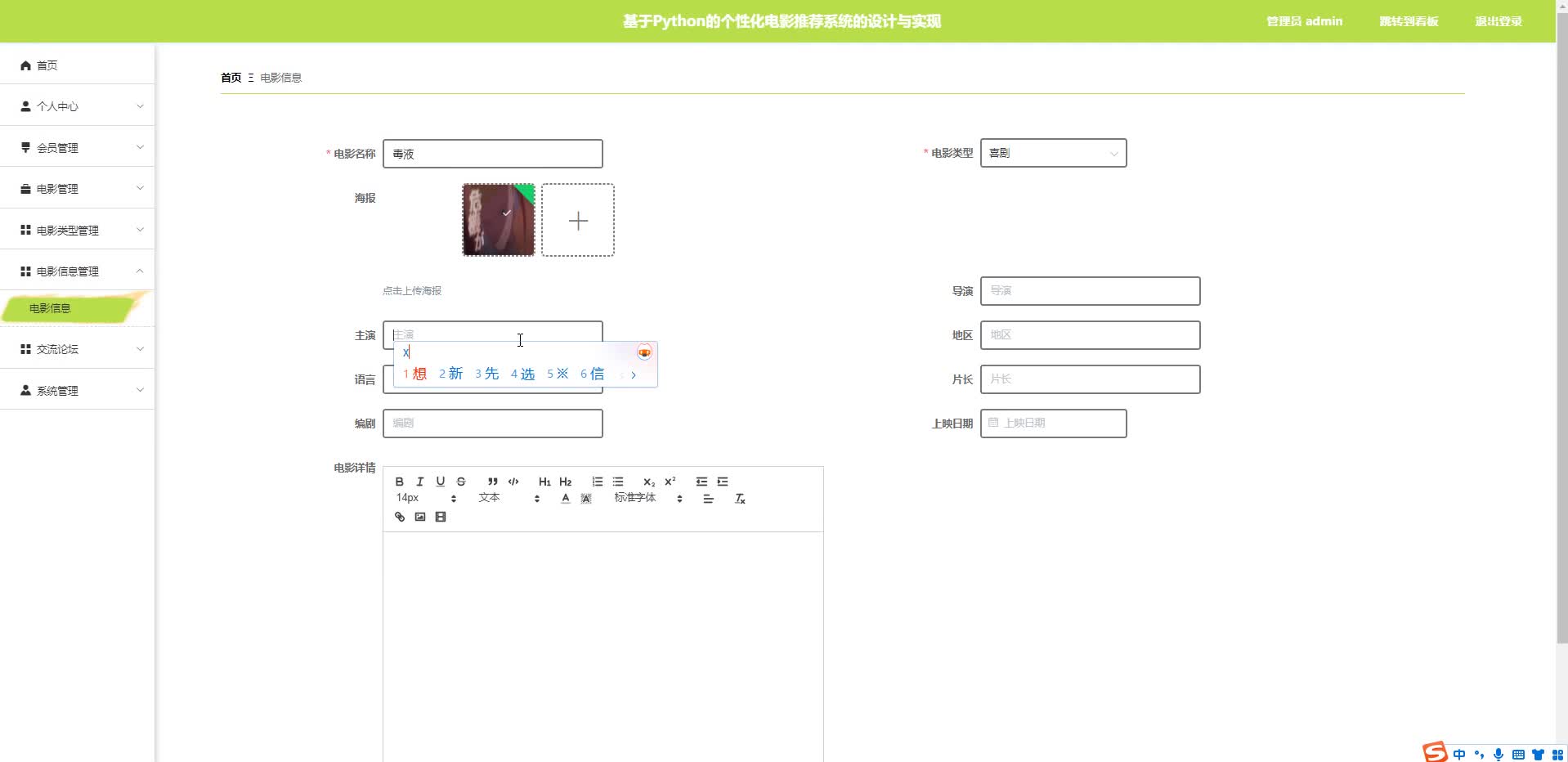 管理员指的是电影公司管理人员或者操作员,通过基于Python的个性化电影推荐系统来完成日常的电影信息管理,包括发布一些基本的电影类型,通过电影类型来爬取电影信息,通过豆瓣电影网进行数据分析,爬取。