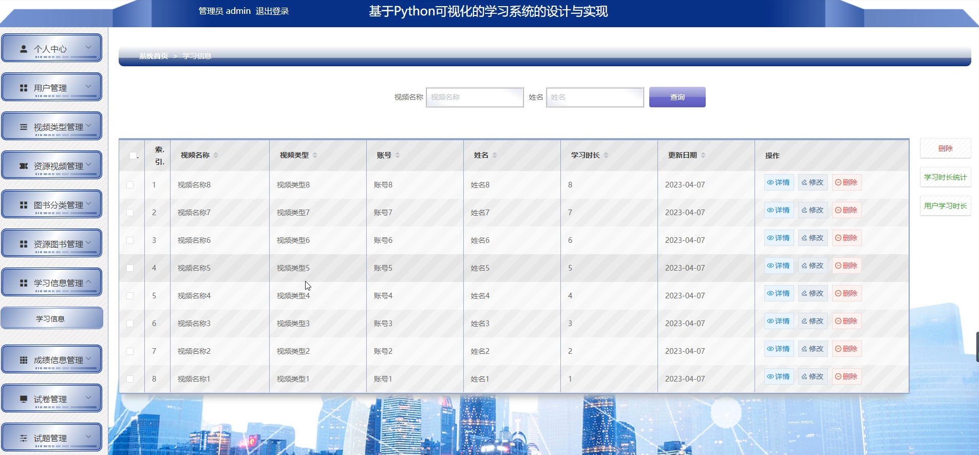 功能: 系统阐述的是使用可视化的学习系统的设计与实现,对于Python、B/S结构、MySql进行了较为深入的学习与应用。主要针对系统的设计,描述,实现和分析与测试方面来表明开发的过程。开发中使用了 django框架和MySql数据库技术搭建系统的整体架构。利用这些技术结合实际需求开发了具有个人中心、用户管理、视频类型管理、资源视频管理、图书分类管理、资源图书管理、学习信息管理、成绩信息管理、试卷管理、试题管理、系统管理、考试管理等功能的系统,最后对系统进行相应的测试,测试系统有无存在问题以及测试用户权限来优化系统,最后系统达到预期目标。