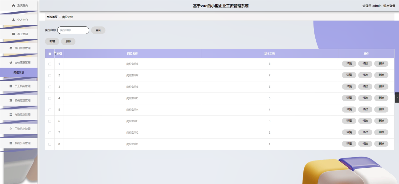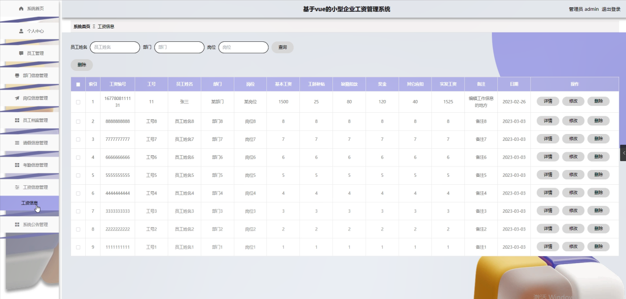 利用电脑网络的这些便利,发展一套小型企业工资管理系统,将会给用户带来更大的效益,而在管理效能上,也必然会有很大的方便!这样可以节省大量的时间和金钱。本系统在小型企业工资管理中不可或缺的一环。该系统主要完成了个人信息修改,对员工管理、部门信息管理、岗位信息管理、员工档案管理、请假信息管理、考勤信息管理、工资信息管理、系统公告管理等功能进行管理。方便了管理员随时随地,只要电脑联网,就能对小型企业工资进行管理。同时,还可以方便快捷查询自己的小型企业工资信息。