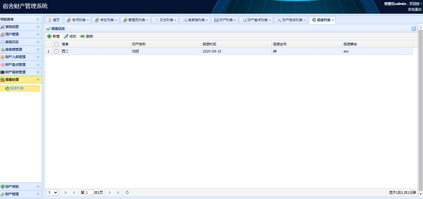 《基于SSM实现的宿舍公共财产管理系统》该项目采用技术 spring+springMVC+mybaits+EasyUI+jQuery+Ajax、mysql数据库、tomcat服务器