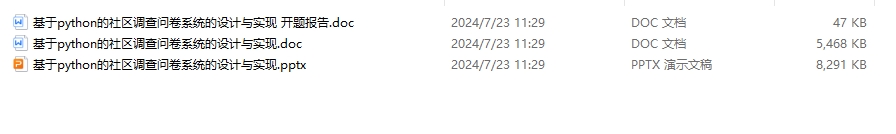 《[含文档+PPT+源码等]精品基于Python实现的django社区调查问卷系统的设计与实现》该项目含有源码、文档、PPT、配套开发软件、软件安装教程、项目发布教程、包运行成功以及课程答疑与微信售后交流群、送查重系统不限次数免费查重等福利!
