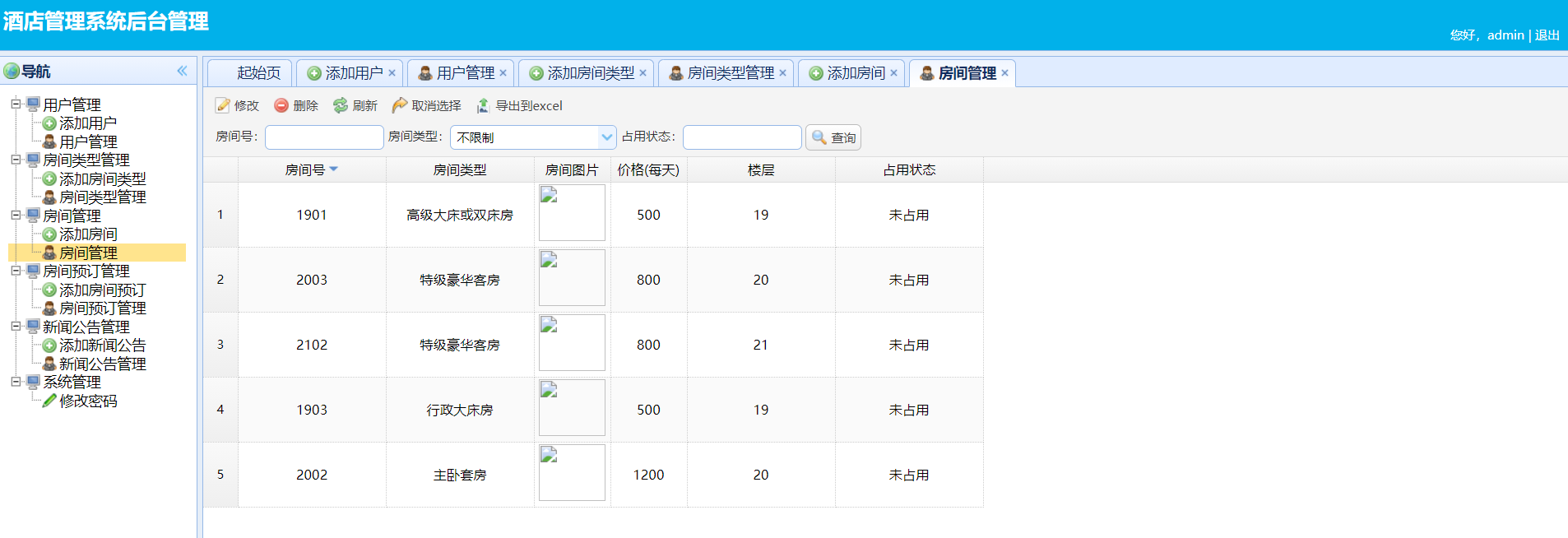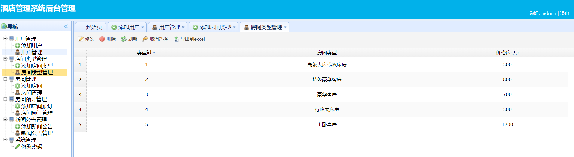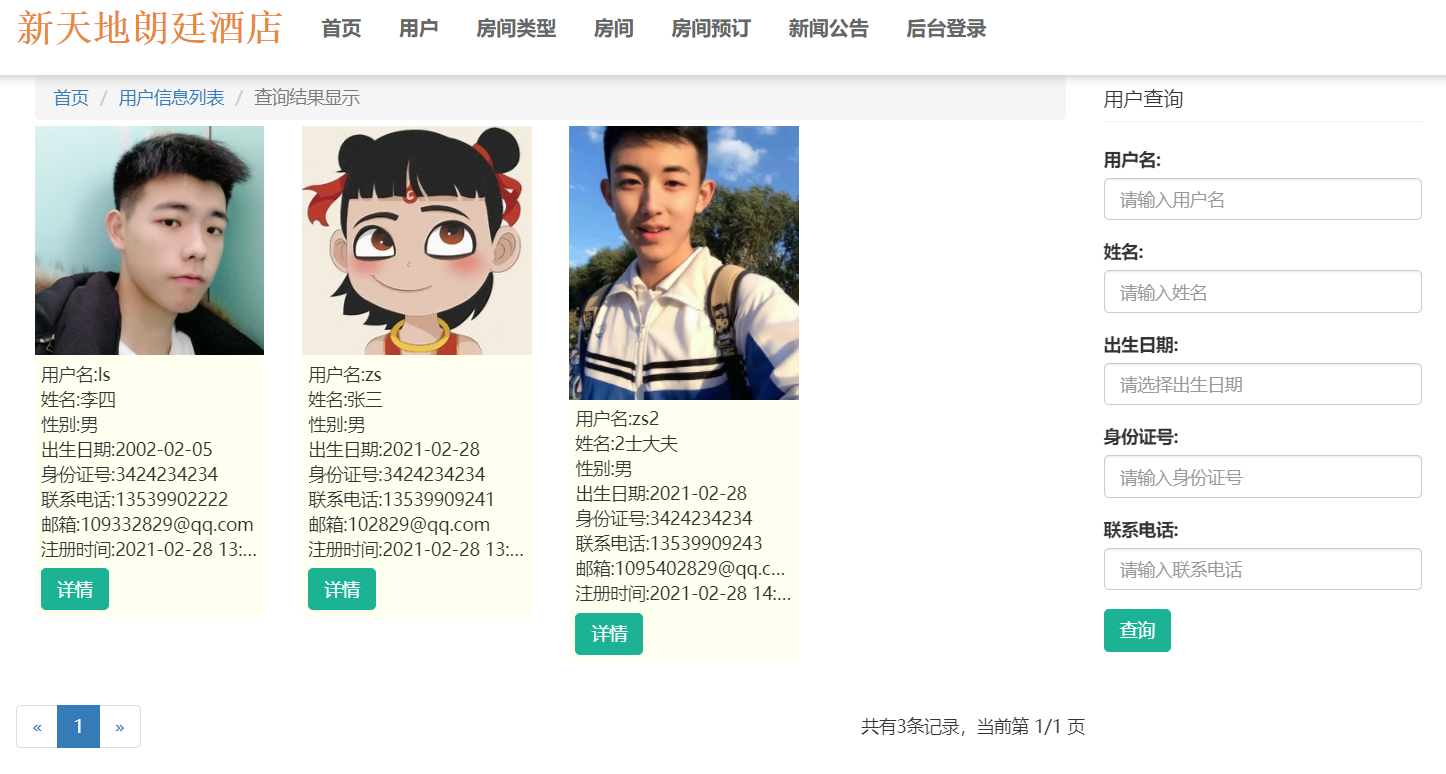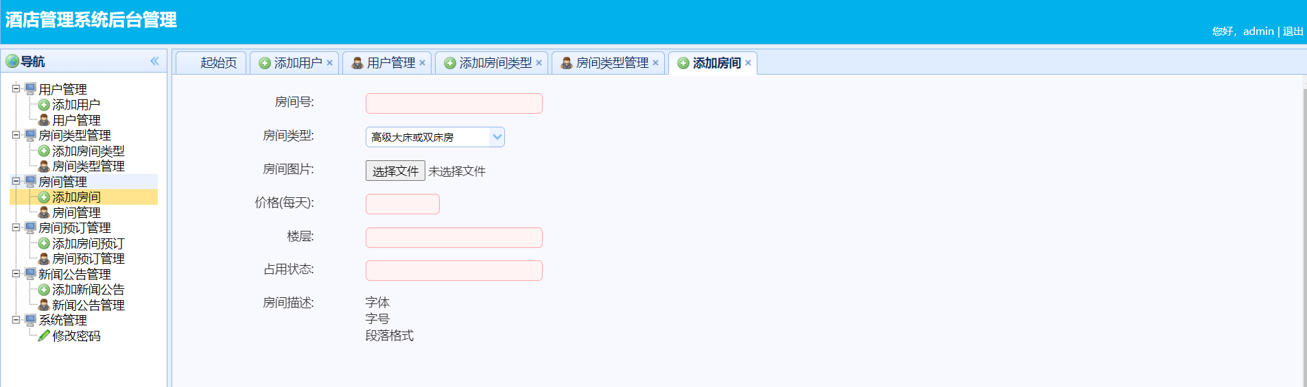 系统分为前台和后台两部分,需要注意的是,这个项目是酒店工作人员使用的,普通工作人员无需登录只能看前台的一些信息,不能预定房间。 管理员能进入后台对用户,房间类型等进行管理,预定房间,留言等。