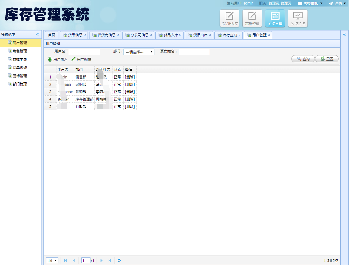 出库管理、入库管理、库存查看等基本功能,此外还实现了完善的权限管理、数据字典管理、菜单管理、用户管理、