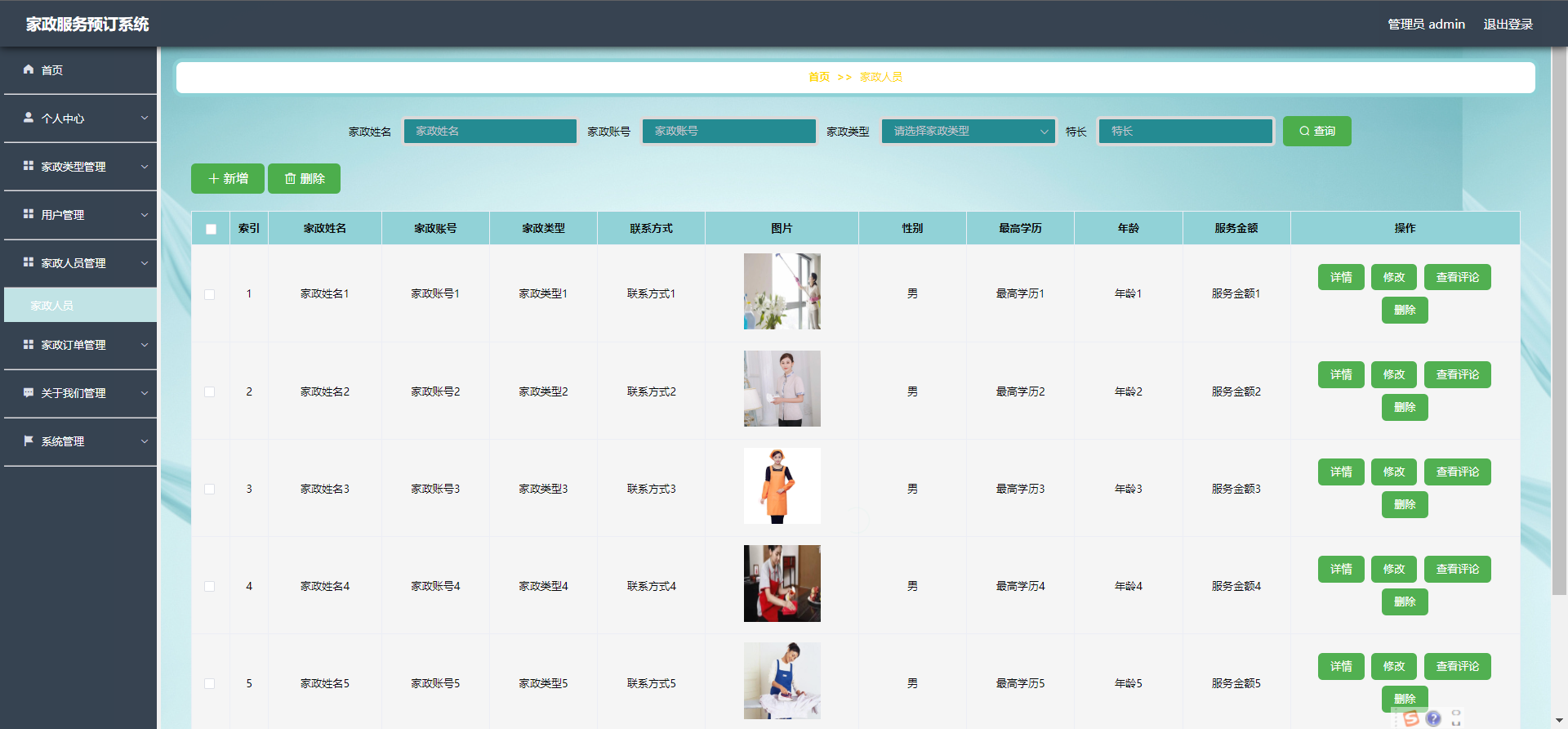 >首页,个人中心,家政类型管理,用户管理,家政人员管理,家政订单管理,关于我们管理,系统管理等功能进行相应的操作管理