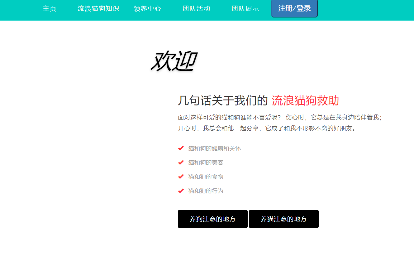 项目分为前端和后端两,包含的功能主要有:流浪猫狗管理,志愿者申请,领养列表、领养中心,团队活动,领养管理等。