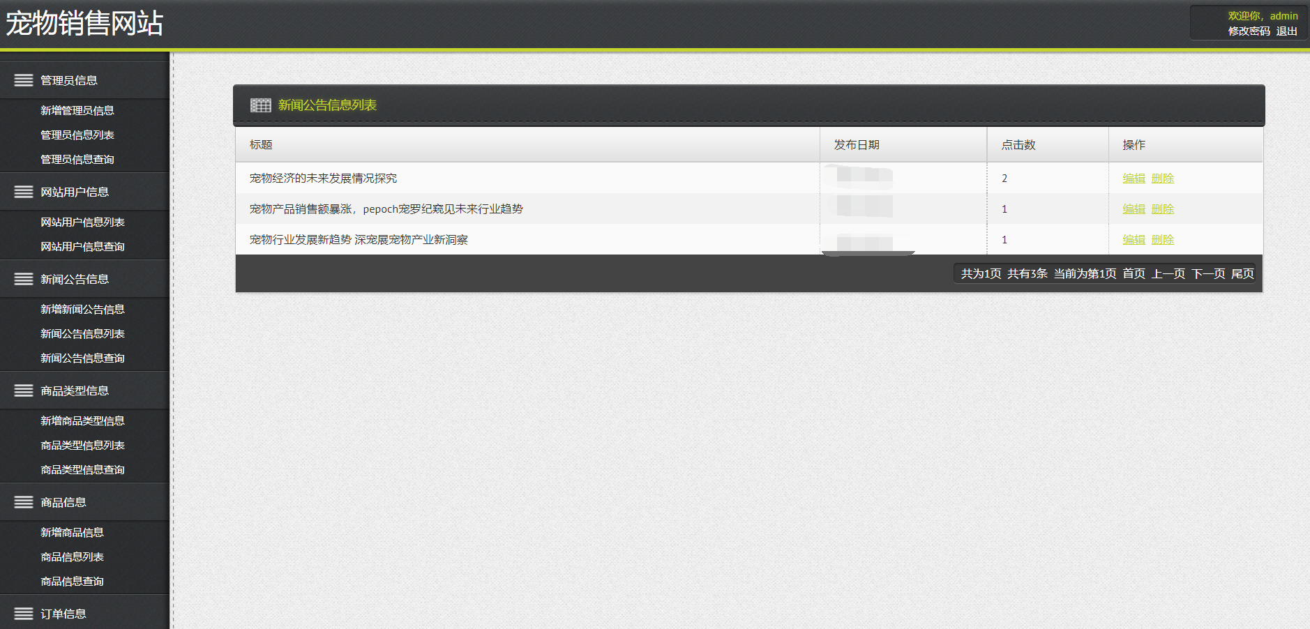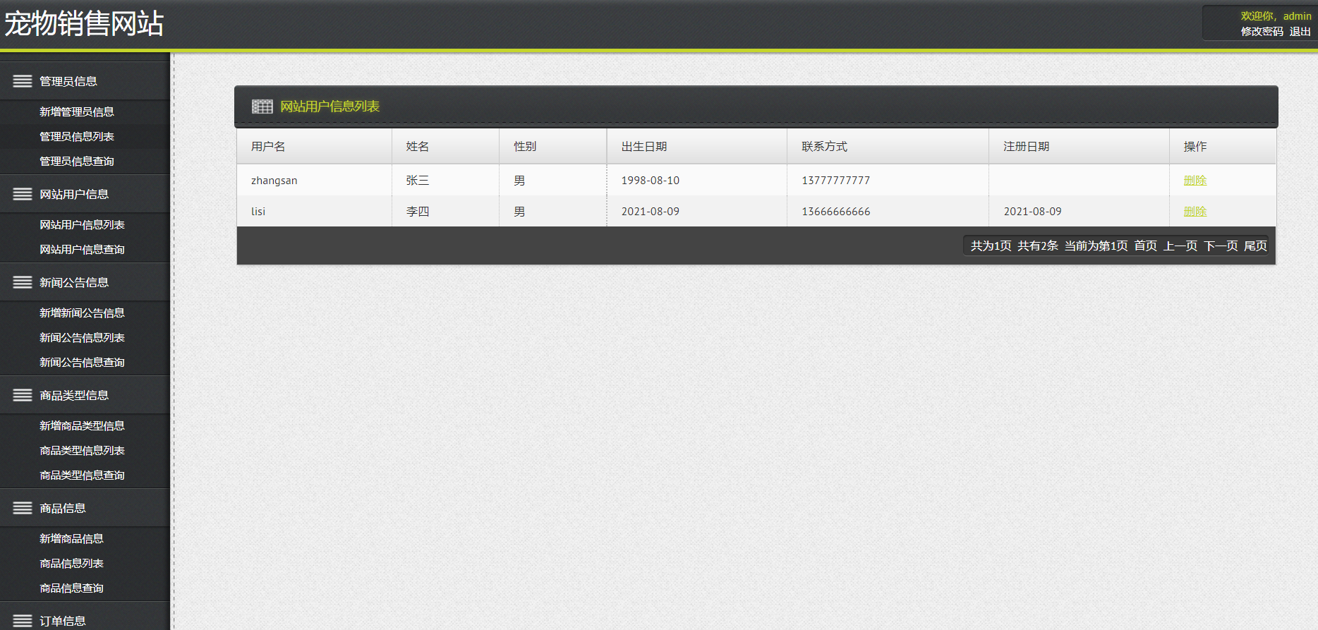 后台系统登陆、用户信息管理、管理员管理、宠物分类管理、宠物