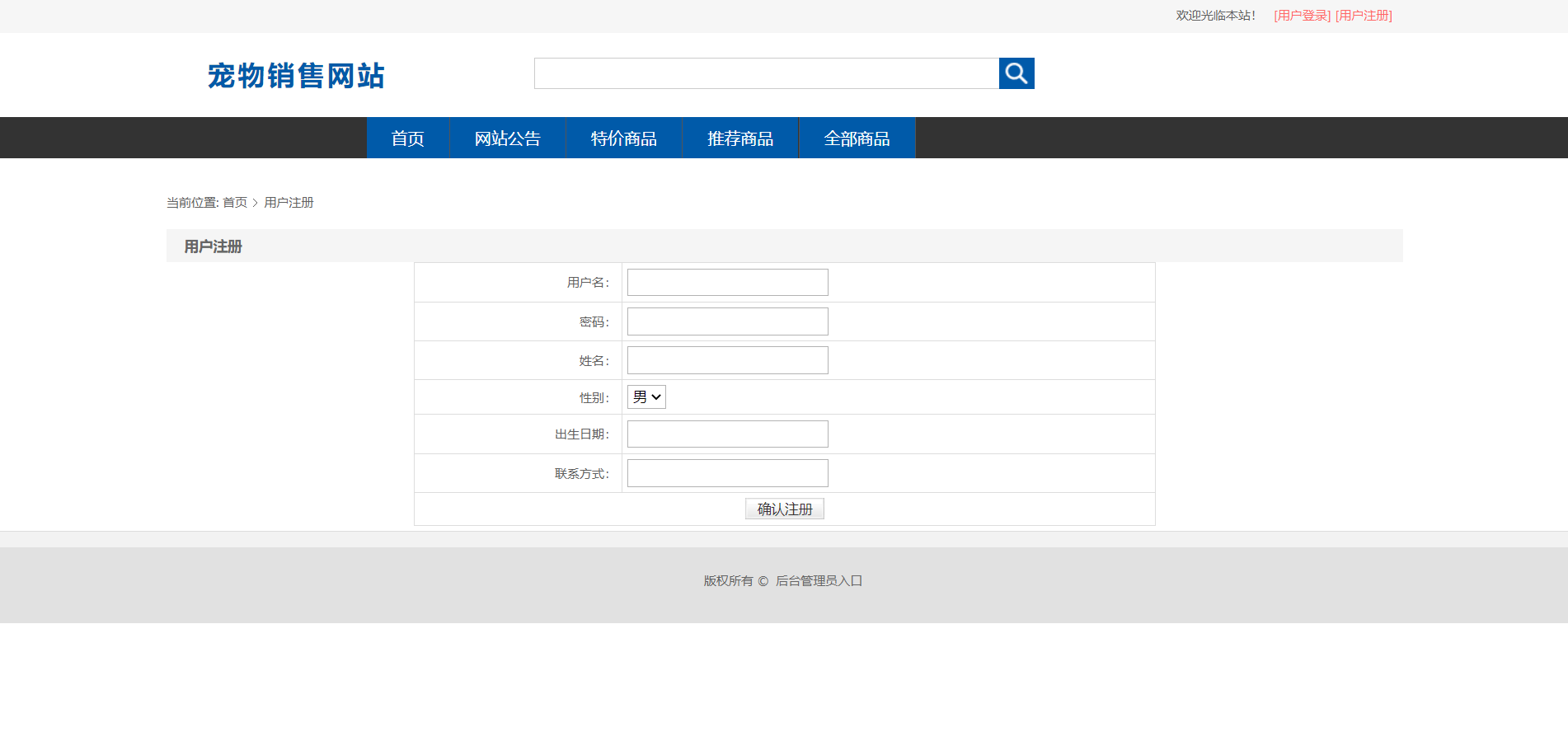 前台首页、宠物商品展示、宠物搜索、宠物分类查找、宠物详情、