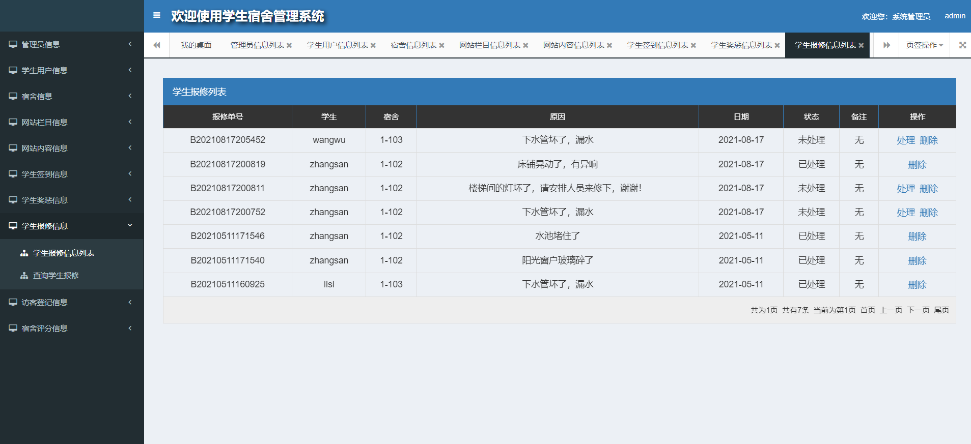 后台系统登陆、学生信息管理、管理员管理、宿舍信息管理、网站公告管理、学生签到管理、学生奖惩管理、学生报修管理、访客