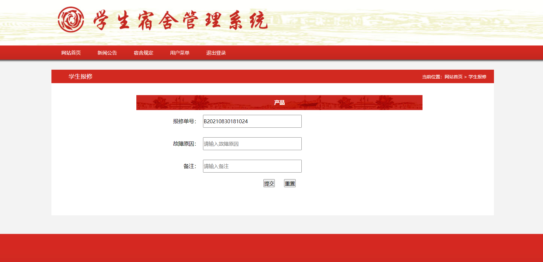 前台首页、新闻公告、宿舍规定、学生注册、学生登陆、个人中心、学生信息、学生报修、我的报修、我的奖惩、学生签到、我的访客、宿舍评分、修改密码等功能。
