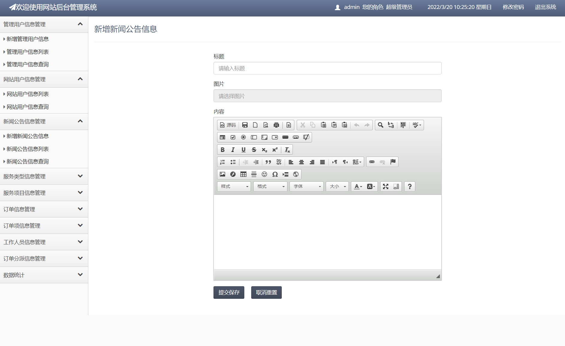 网站用户信息管理;新闻公告信息管理;服务类型管理;服务项目信息管理;订单信息管理;