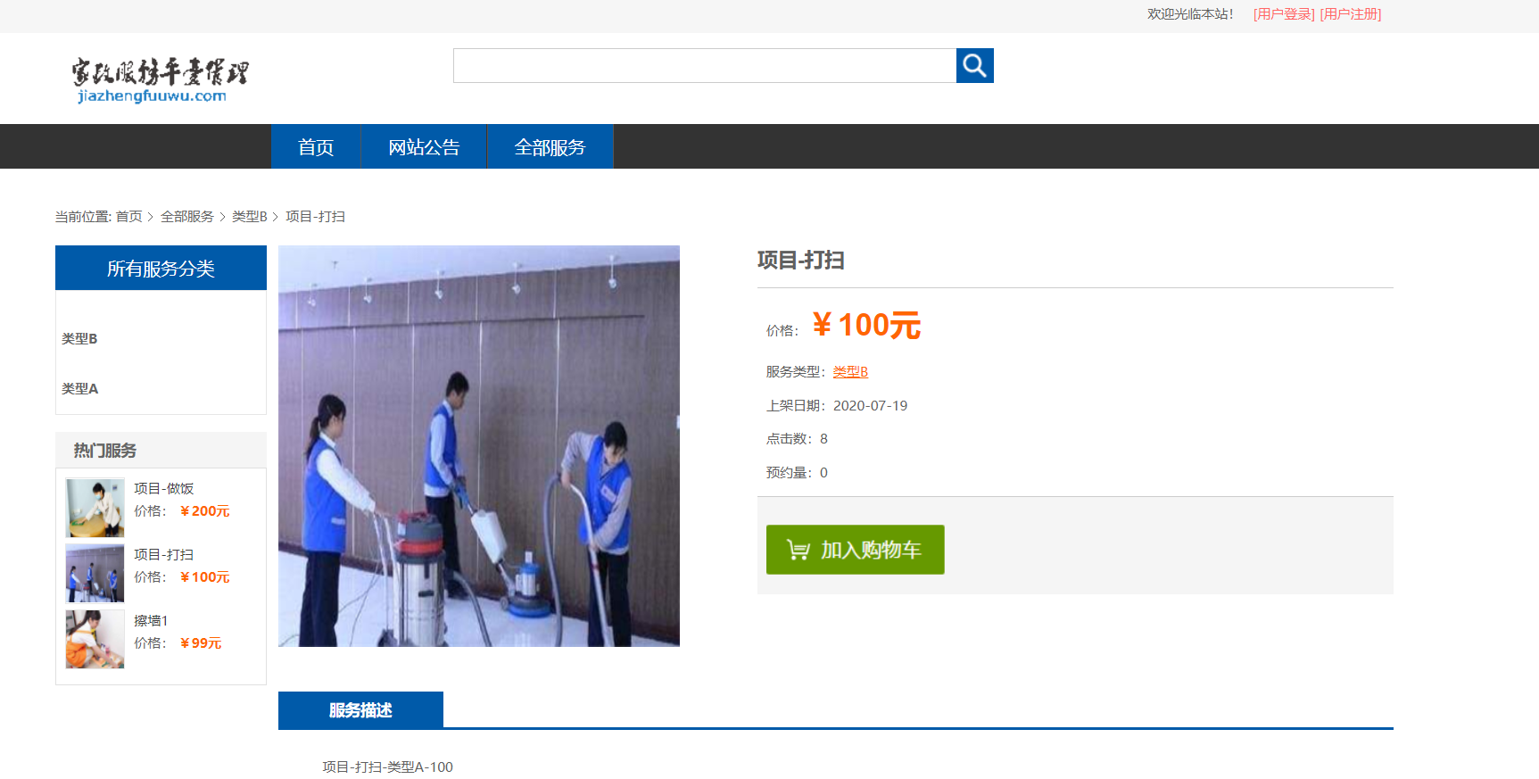 用户可以注册登录,修改个人信息,修改密码,查看服务分类对应的服务项目,查看服务项目详情,将服务项目加入购物车, 对购物车项目进行购买,在线下单,查看订单,付款, 查看公告