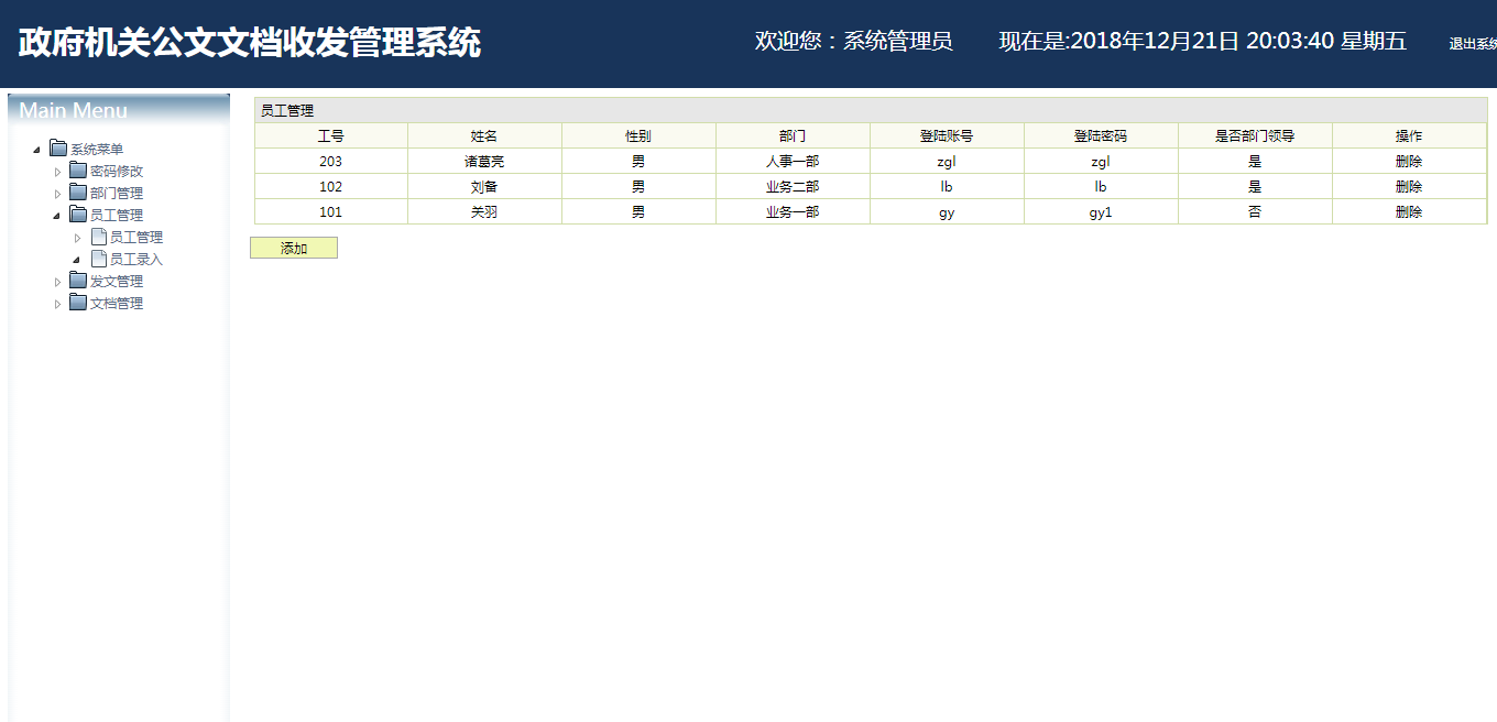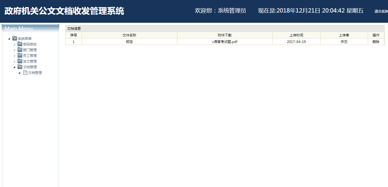 管理员功能主要包括密码修改、部门管理、员工管理、发文管理和文档管理模块;