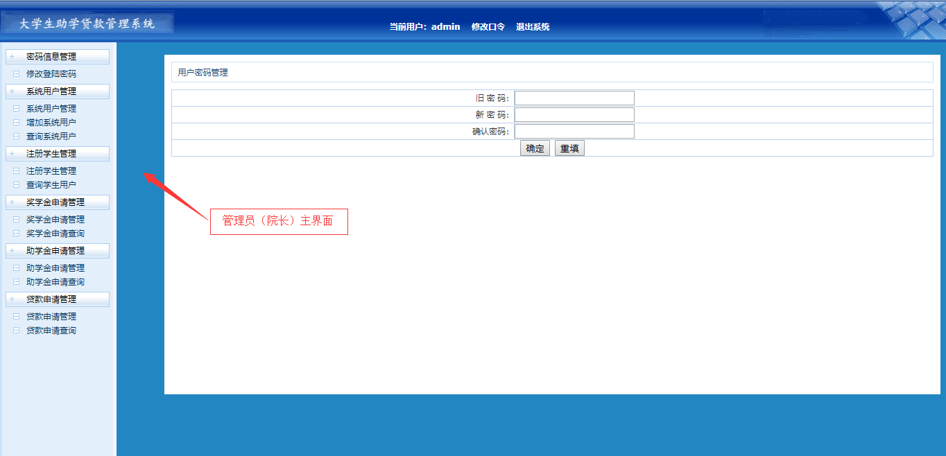 管理员(院长):密码信息管理、系统用户管理、注册学生管理、奖学金申请管理、助学金申请管理、贷款申请管理。