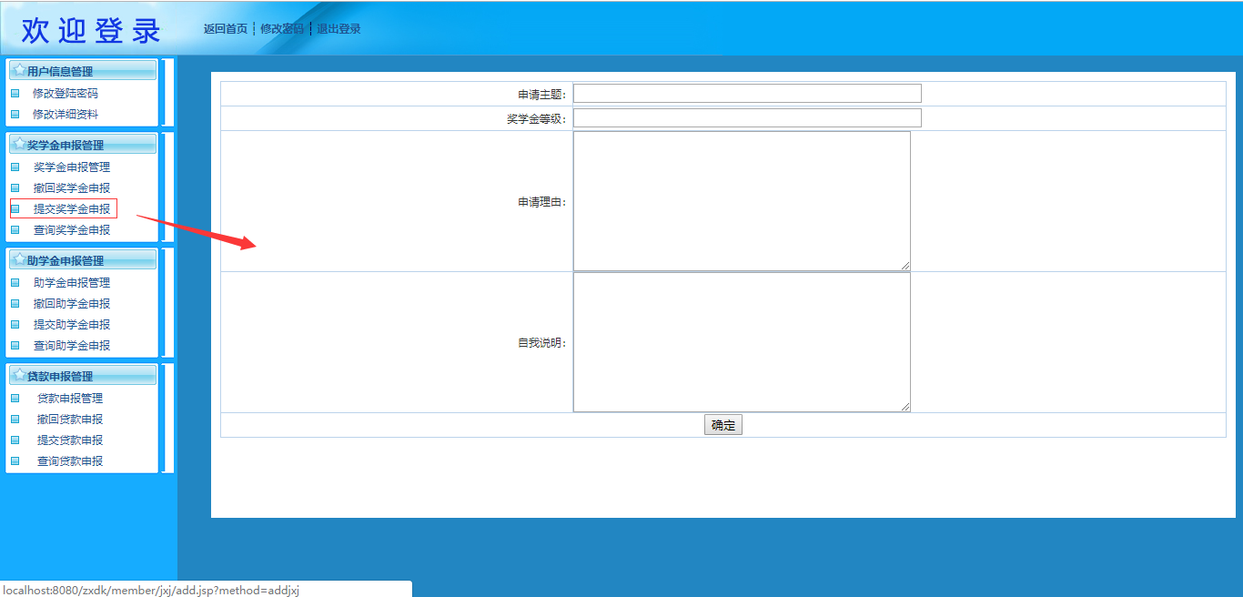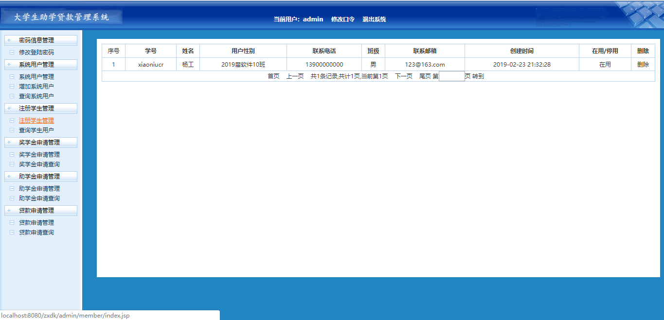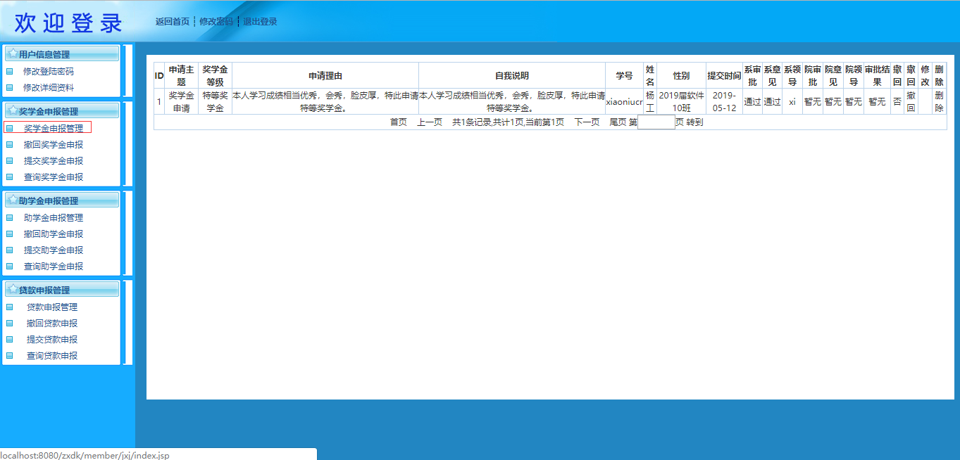 本系统为基于jsp+mysql的高校助学贷款管理系统,包含学生、系领导、学员领导、管理员等登陆权限,功能如下: