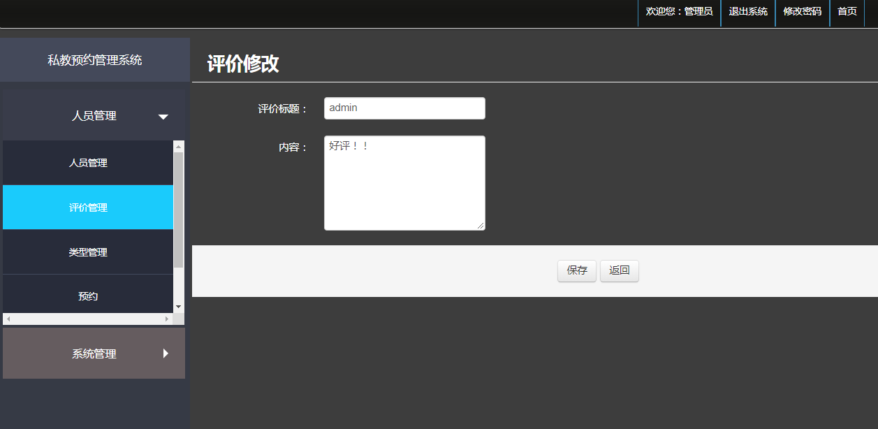 后台管理:登录、注册、人员的增删改查、评价的增删改查、私教类型的增删改查、后台预约私教、 用户的添加删除修改、角色的添加删除修改、菜单的添加删除修改。