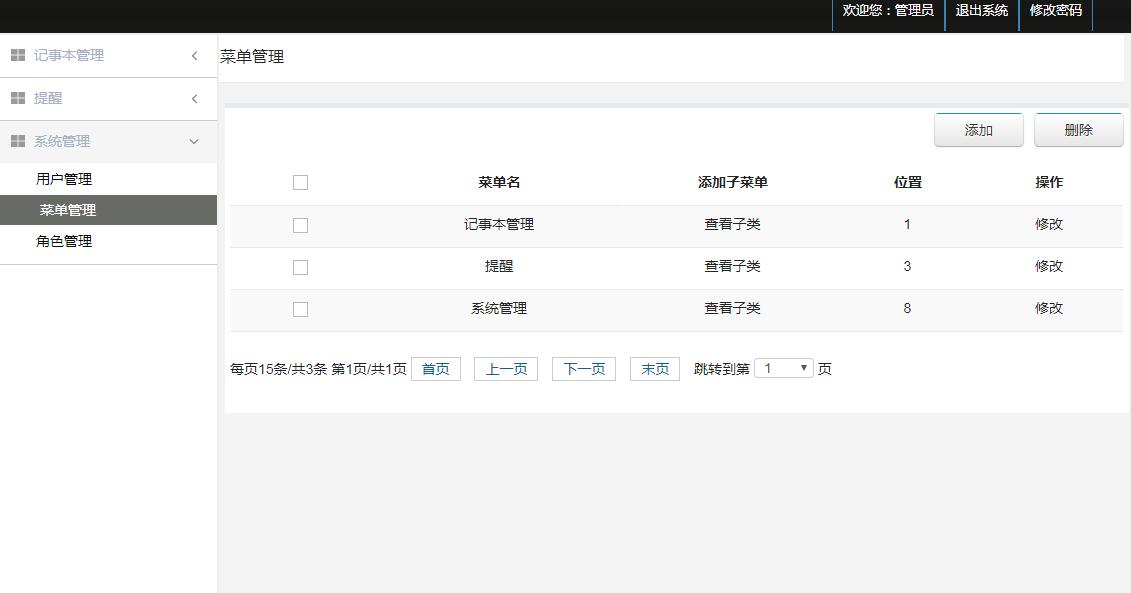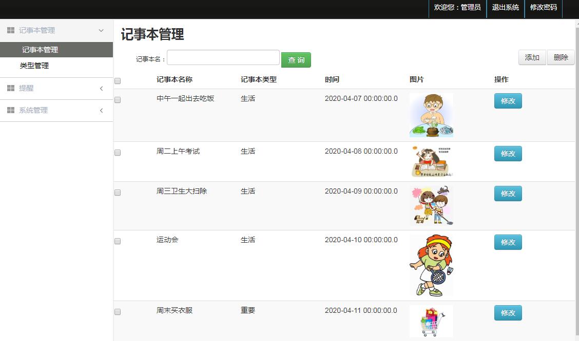 后台管理:登录、记事本管理、类型的增删改查 用户的添加删除修改、角色的添加删除修改、菜单的添加删除修改。