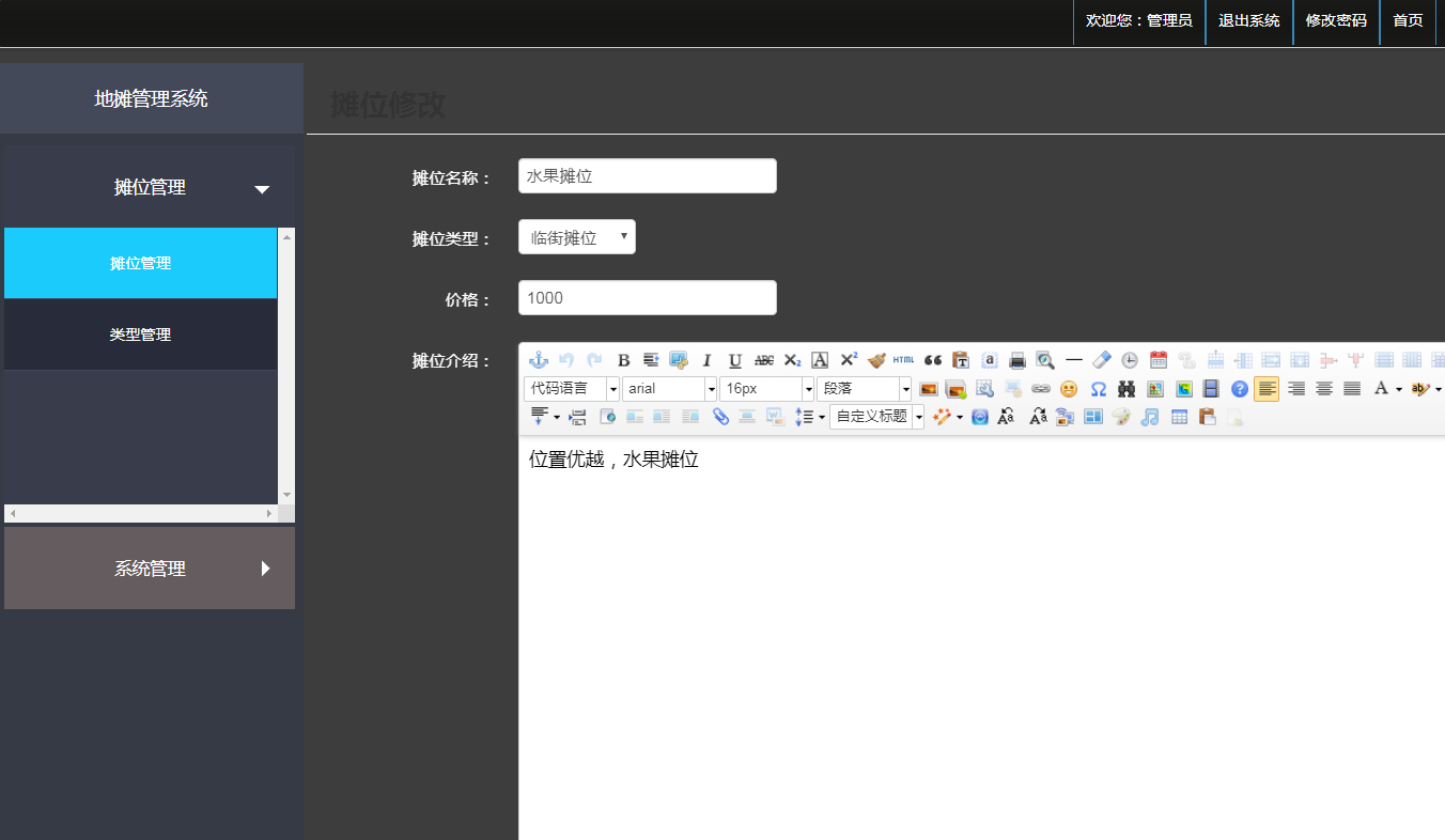 后台管理:登录、注册、摊位的增删改查及租赁的审核、类型的增删改查、 用户的添加删除修改、角色的添加删除修改、菜单的添加删除修改。