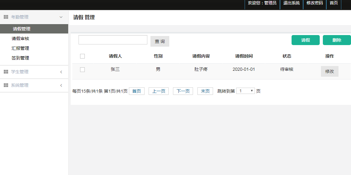 前台功能介绍:查看并搜索所有的学生信息,查看请假信息、签到打卡、修改个人信息、登录、注册