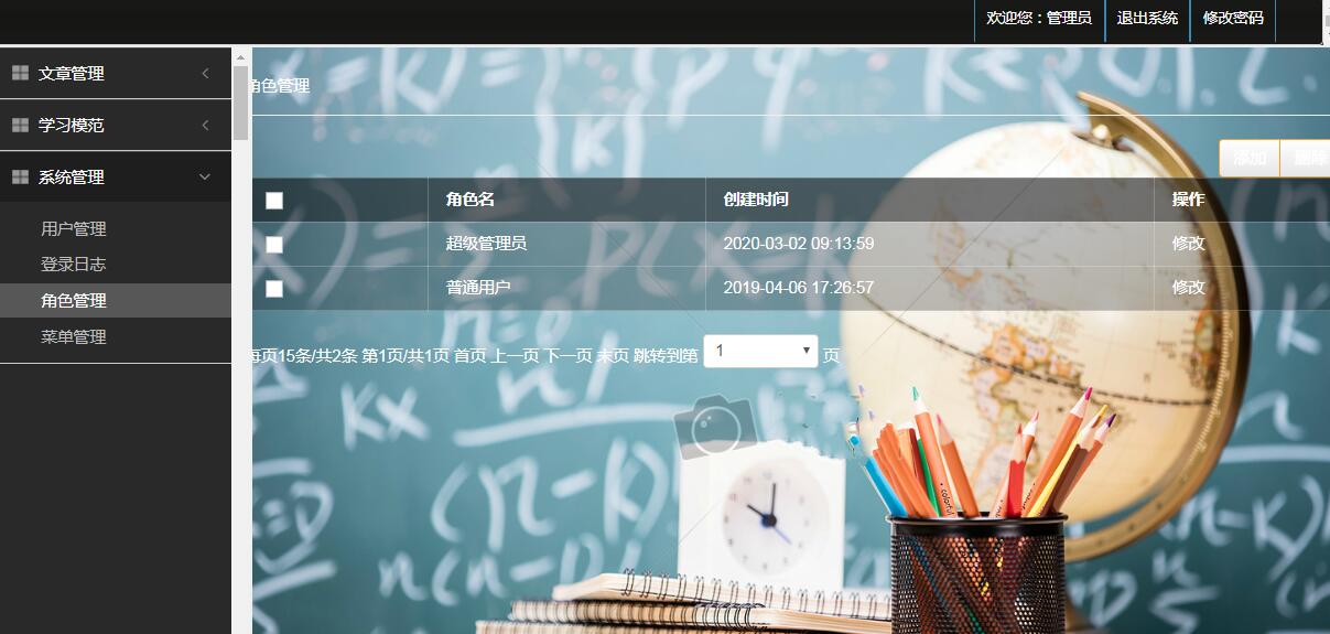 后台管理:登录、注册、评价的增删改查、文章的增删改查、文章类型的增删改查、学习模范的查询删除、 用户的添加删除修改、角色的添加删除修改、菜单的添加删除修改。
