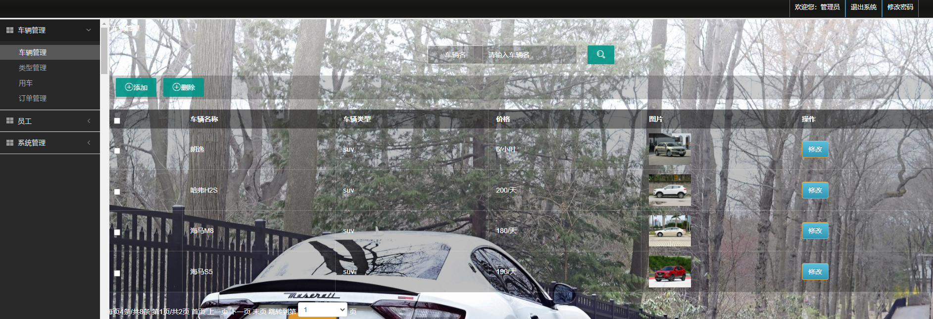 后台管理:登录、注册、车辆的增删改查、车辆类型的增删改查、订单的查询删除支付、员工信息的管理、 用户的添加删除修改、角色的添加删除修改、菜单的添加删除修改。