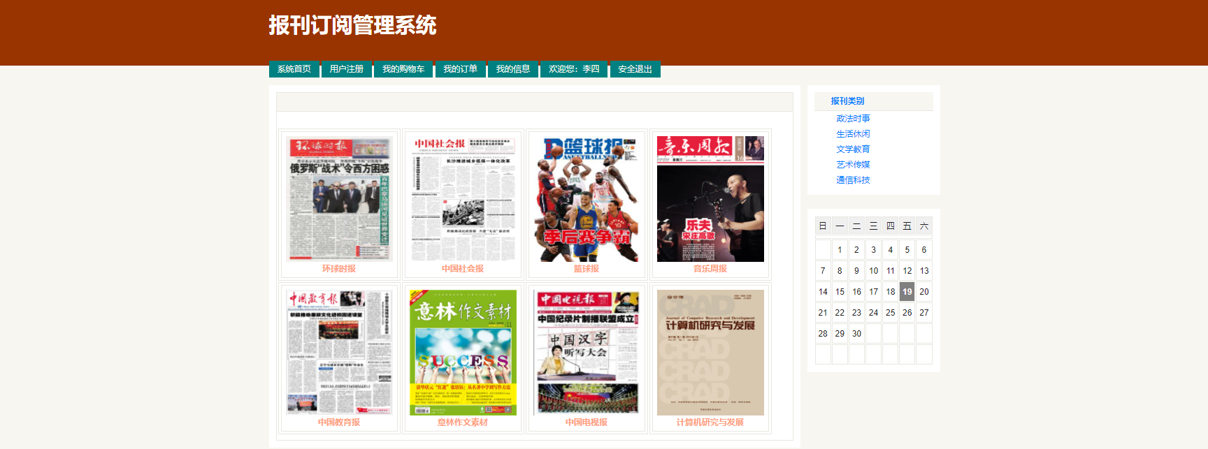 前台:用户可以注册、登录、查看报刊分类、报刊列表、报刊详情、个人信息、加入购物车、下单等功能。