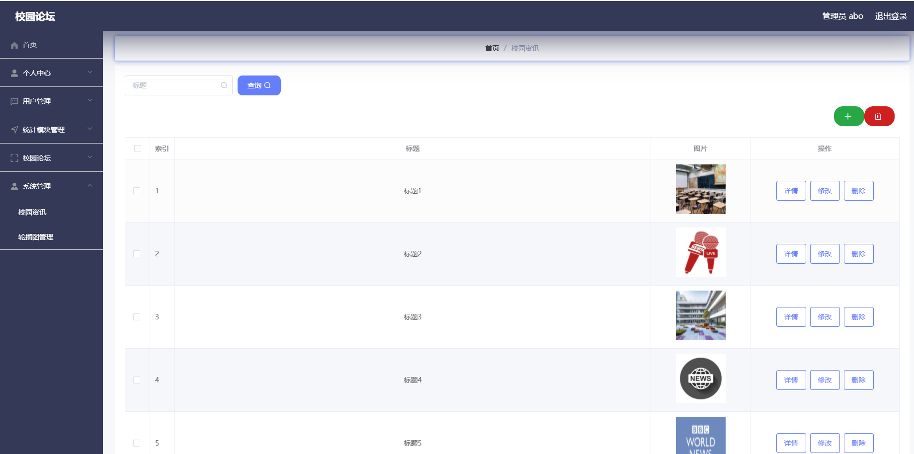 5. 系统管理:可以对校园资讯信息进行添加、查看、修改或删除,对轮播图信息进行查看或修改。