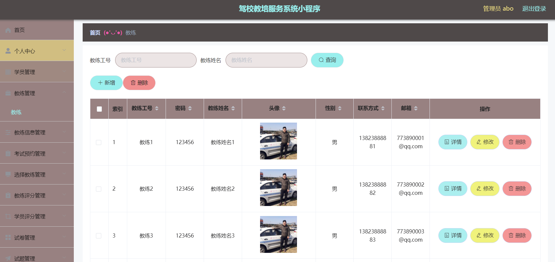 2、管理员服务端;首页、个人中心、学员管理、教练管理、教练信息管理、考试预约管理、选择教练管理、 教练评分管理、学员评分管理、试卷管理、试题管理、系统管理、考试管理等。