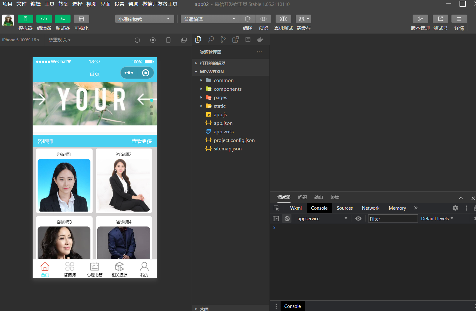 咨询师客户端:首页、咨询师、心理书籍、相关资源、我的,
