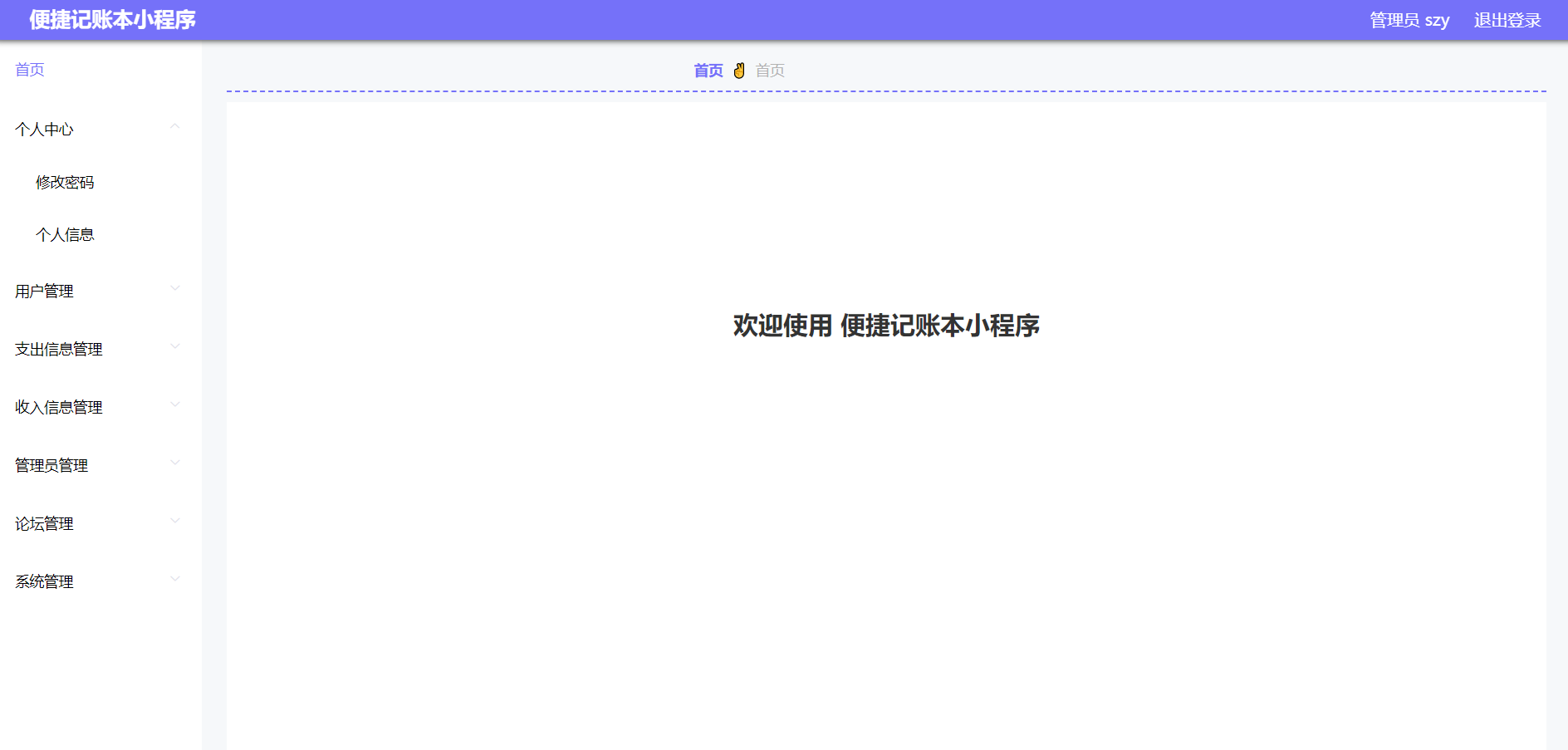 管理员服务端;首页、个人中心、用户管理,支出信息管理、收入信息管理、管理员管理、论坛管理、系统管理,
