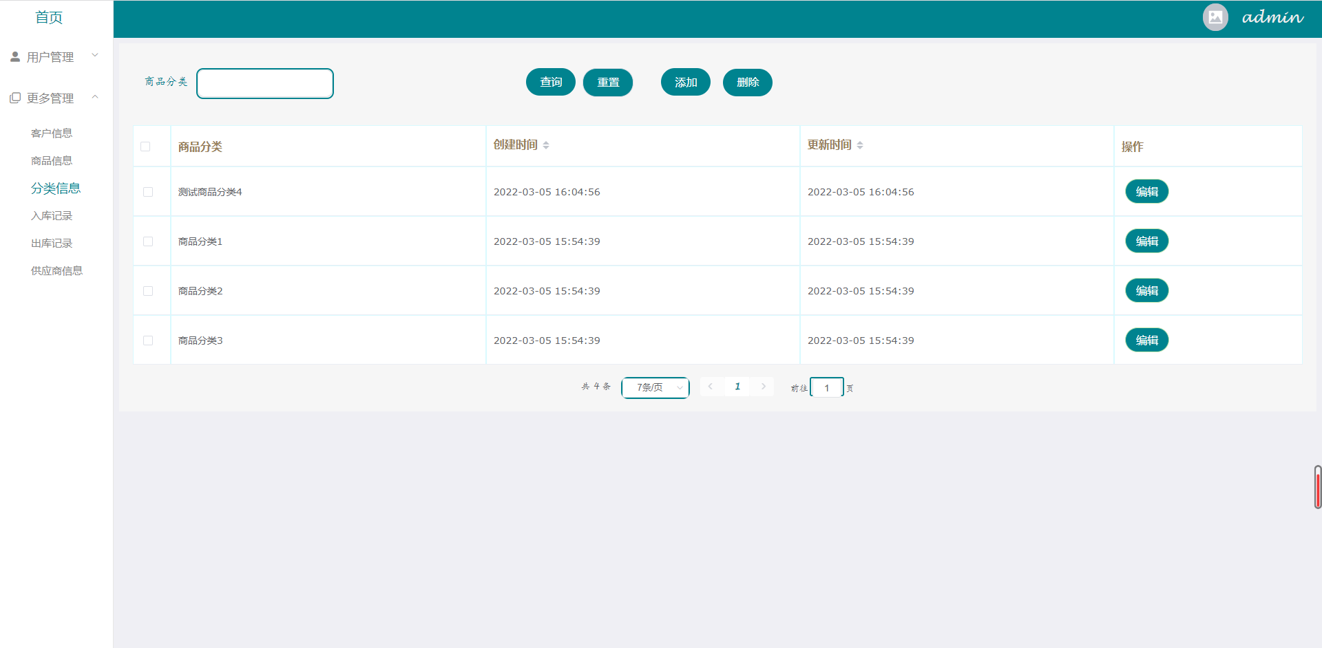 管理员模块: 主要功能有:后台首页、用户管理、商品信息、客户信息、分类信息、入库记录、出库记录、供应商信息等功能。