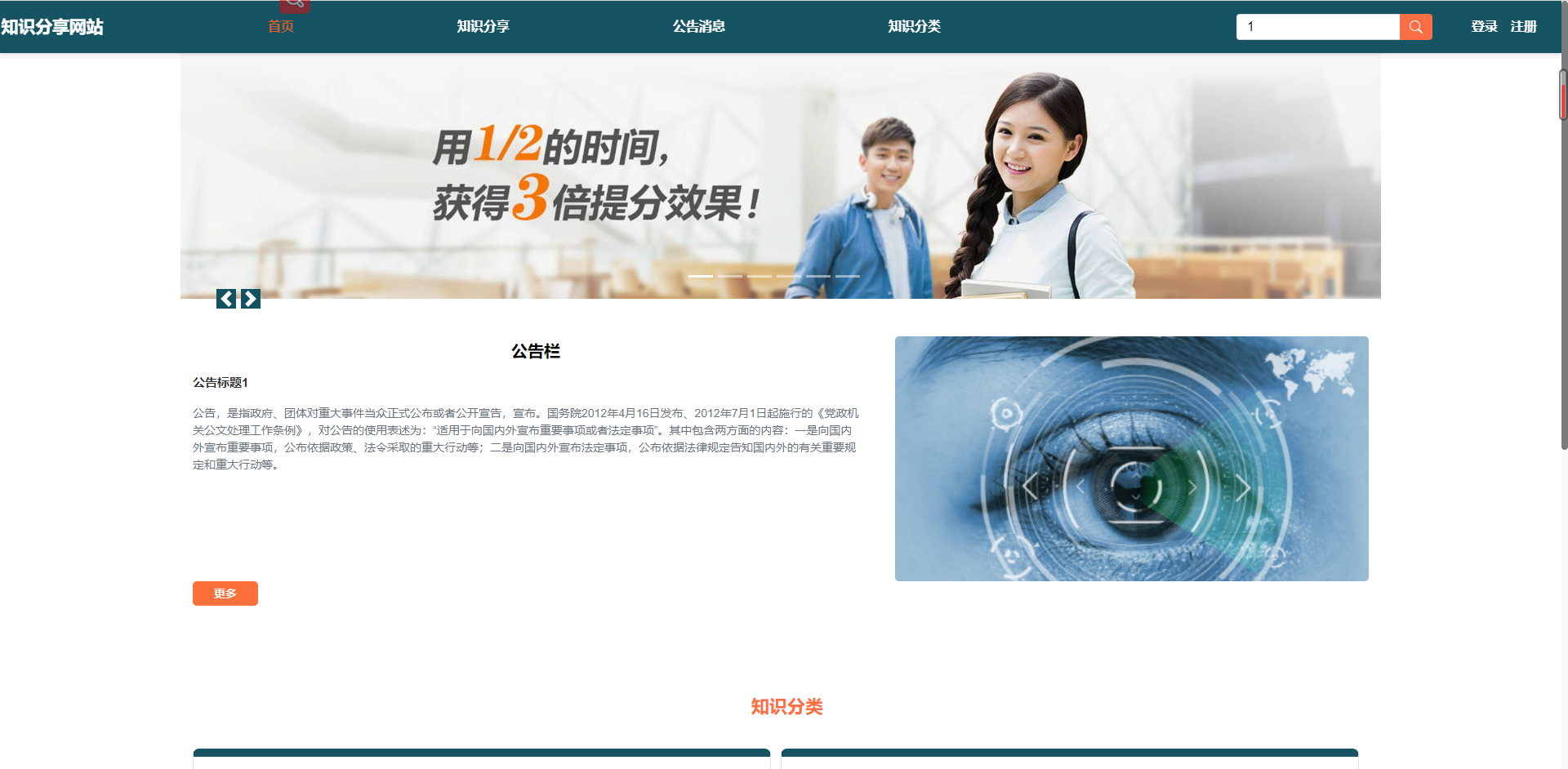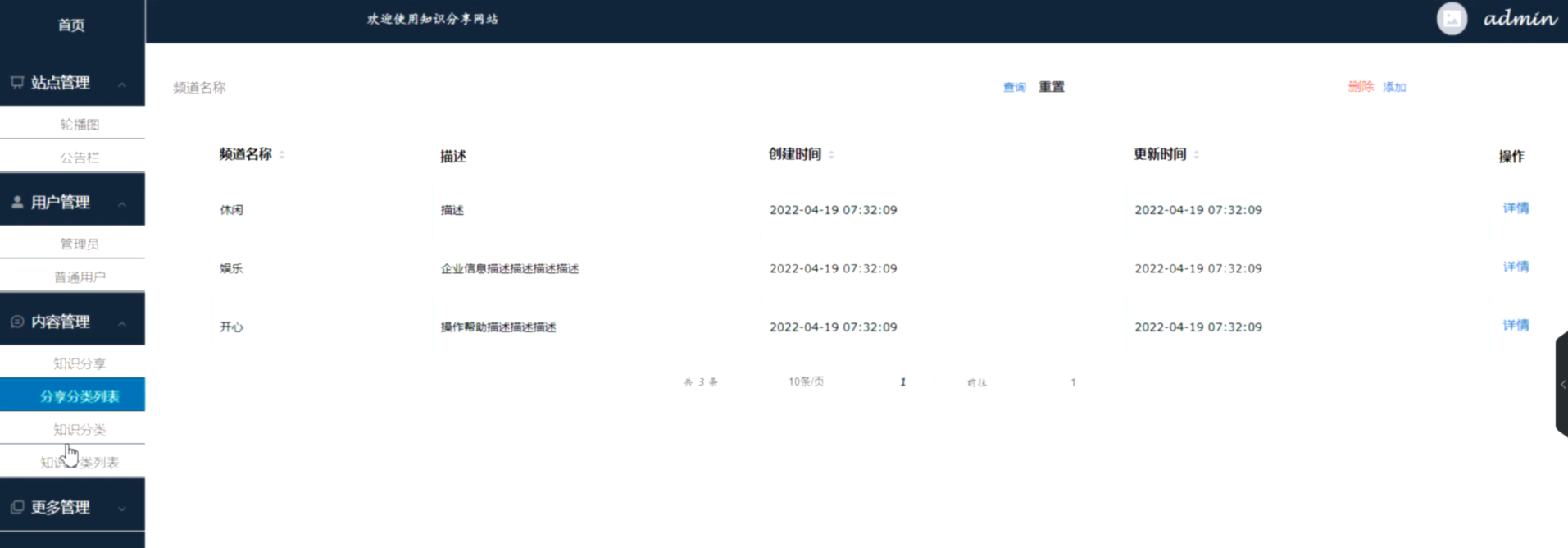 首页、站点管理(轮播图、公告栏)用户管理(管理员、普通用户) 内容管理(知识分享、分享分类列表、知识分类、知识分类列表)更多管理(知识推广情况)等功能。前台用户:用户进入系统可以查看首页、知识分享、公告消息、知识分类等操作。
