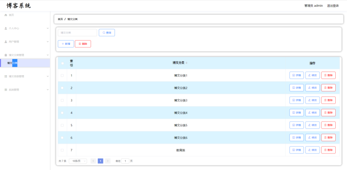 管理员:首页、个人中心、用户管理、博文分类管理、博文信息管理、系统管理等