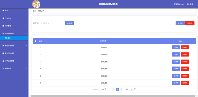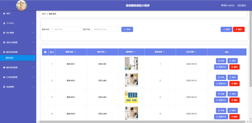 管理员:首页、个人中心、用户管理、项目分类管理、服务项目管理、服务预约管理、订单信息管理、系统管理等
