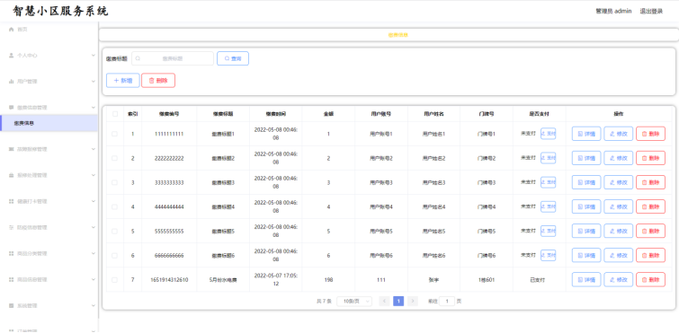 管理员:首页、个人中心、用户管理、缴费信息管理、故障报修管理、报修处理管理、健康打卡管理、防疫信息管理、商品分类管理、商品信息管理、系统管理、订单管理等