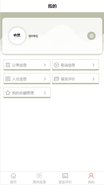 管理员:个人中心、用户管理、酒店信息管理、订单信息管理、取消信息管理、入住信息管理、留言评价管理、系统管理