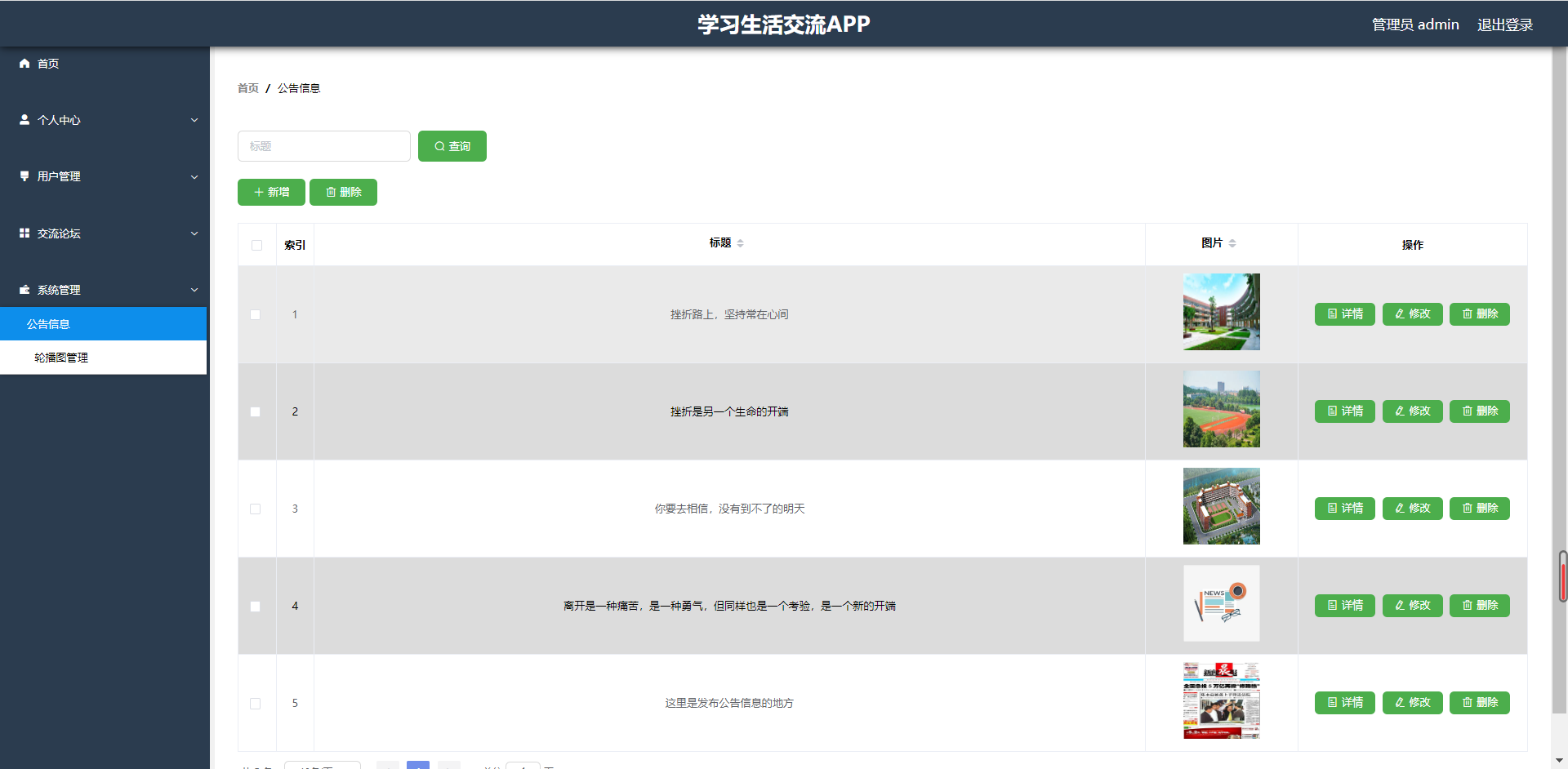 管理员:首页、个人中心、用户管理、交流论坛、系统管理等