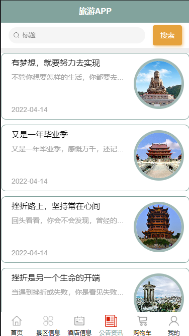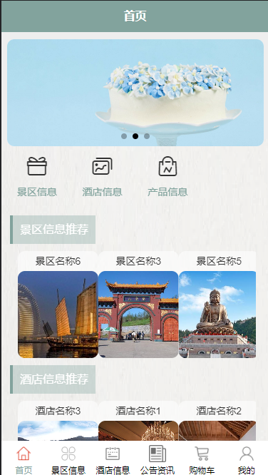 普通用户:首页、景区信息、酒店信息、公告资讯、购物车、我的等