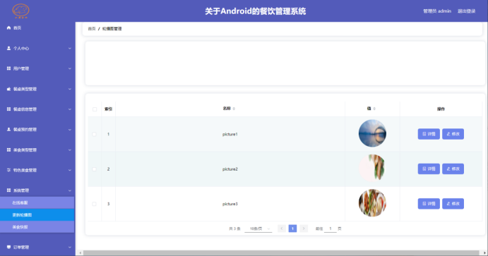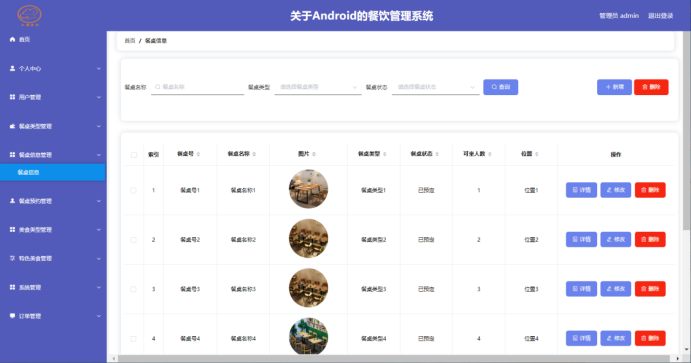 管理员:首页,个人中心,用户管理,餐桌类型管理,餐桌信息管理,餐桌预约管理,美食类型管理,特色美食管理,系统管理,订单管理等