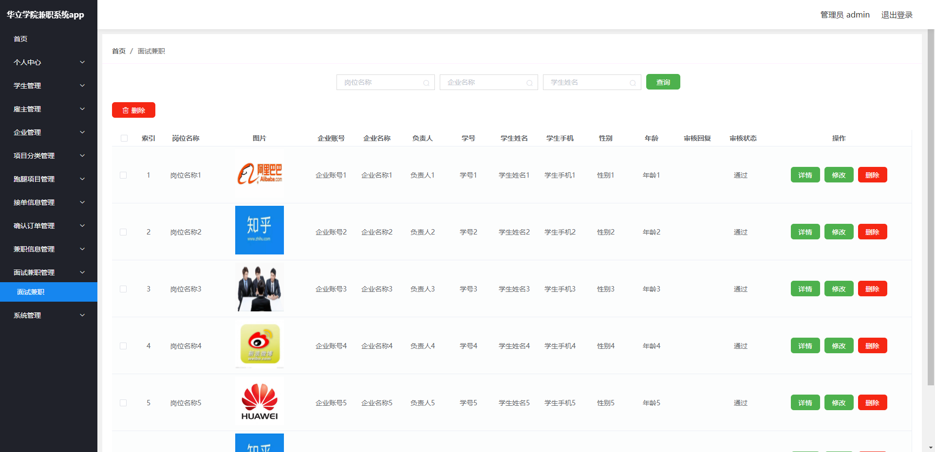 管理员:首页、个人中心、学生管理、雇主管理、企业管理、项目分类管理、跑腿项目管理、 接单信息管理、确认订单管理、兼职信息管理、面试兼职管理、系统管理等