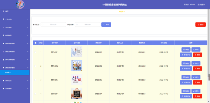 管理员:个人中心、学生管理、教师管理、课程信息管理、课程分类管理、课件资源管理、课程章节管理、交流论坛、系统管理等