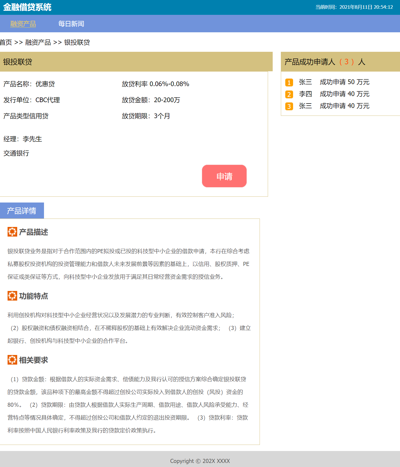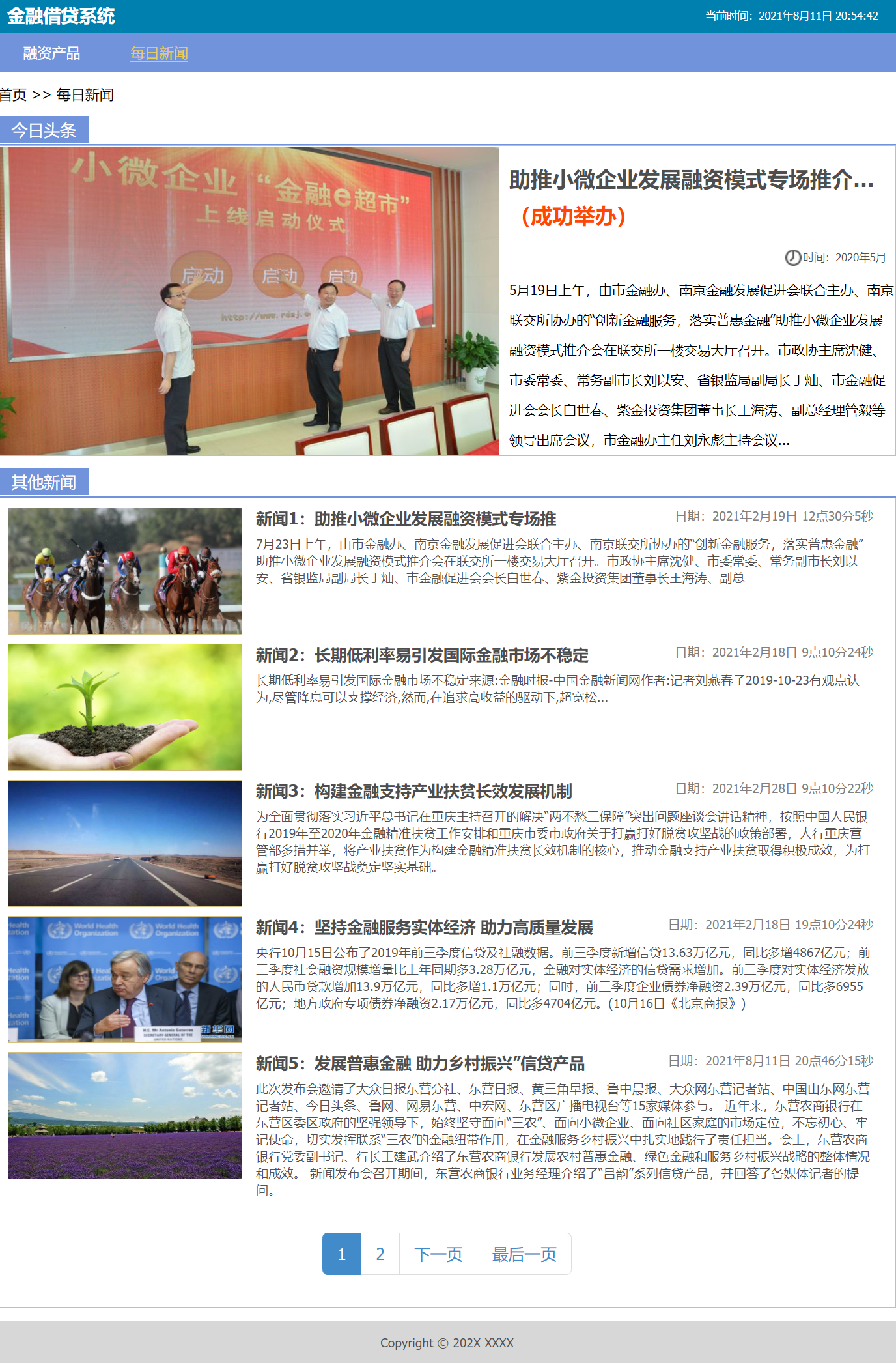 1. 前台主页 : 融资产品查询、产品详情、申请贷款、每日新闻查询、新闻详情