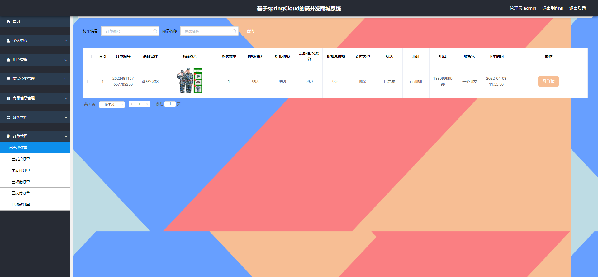 管理员:首页、个人中心、 用户管理、商品分类管理、商品信息管理、系统管理、订单管理等