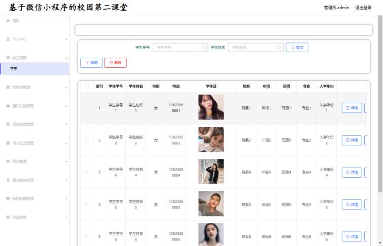 管理员:个人中心、学生管理、组织者管理、通知公告管理、活动推荐管理、活动分类管理、活动管理、活动报名管理、我的收藏管理、系统管理等