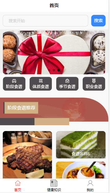 普通用户:登录注册、首页、健康知识、我的等内容,在首页还可查看阶段食谱、体质食谱、季节食谱、职业食谱等内容