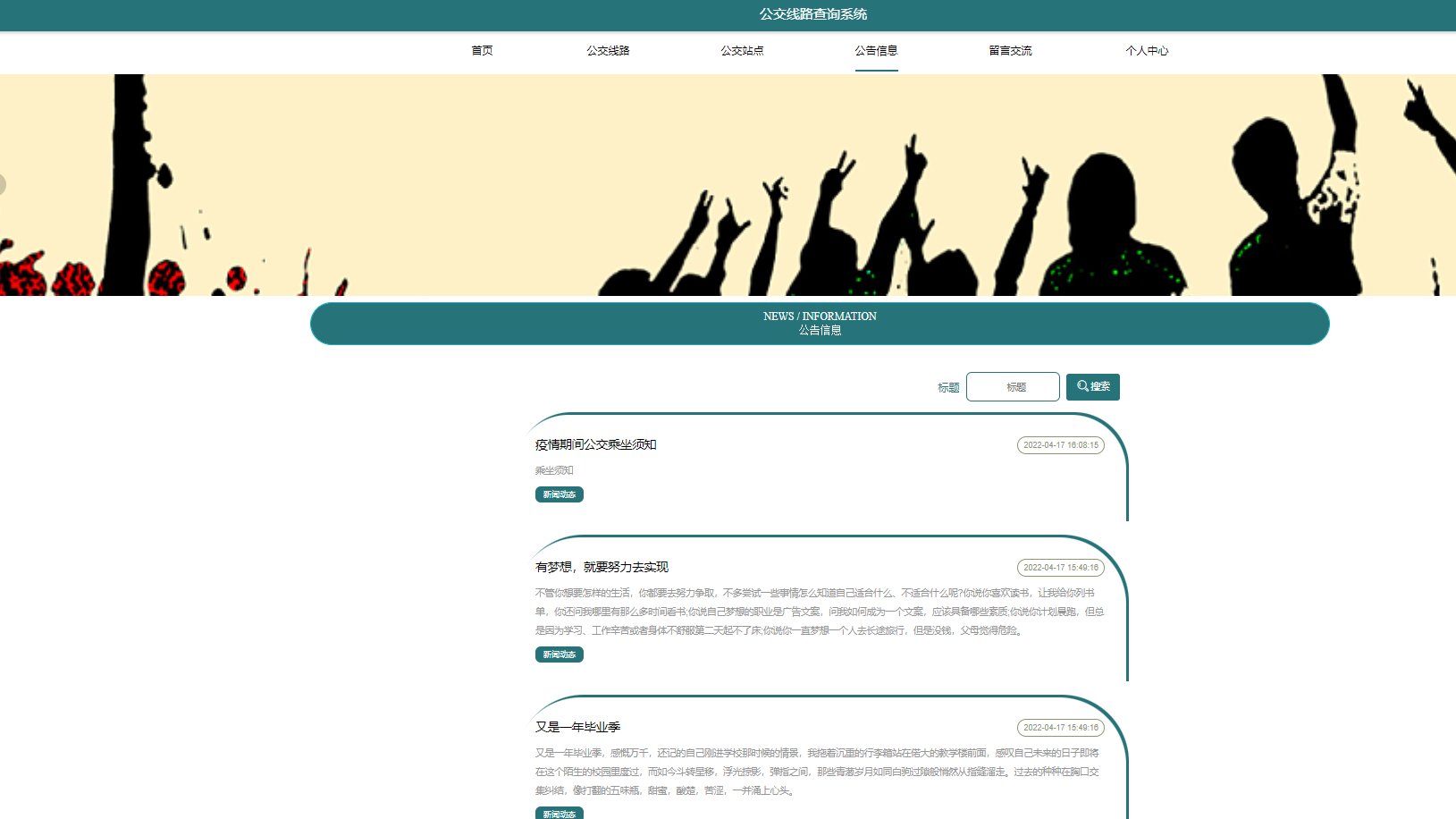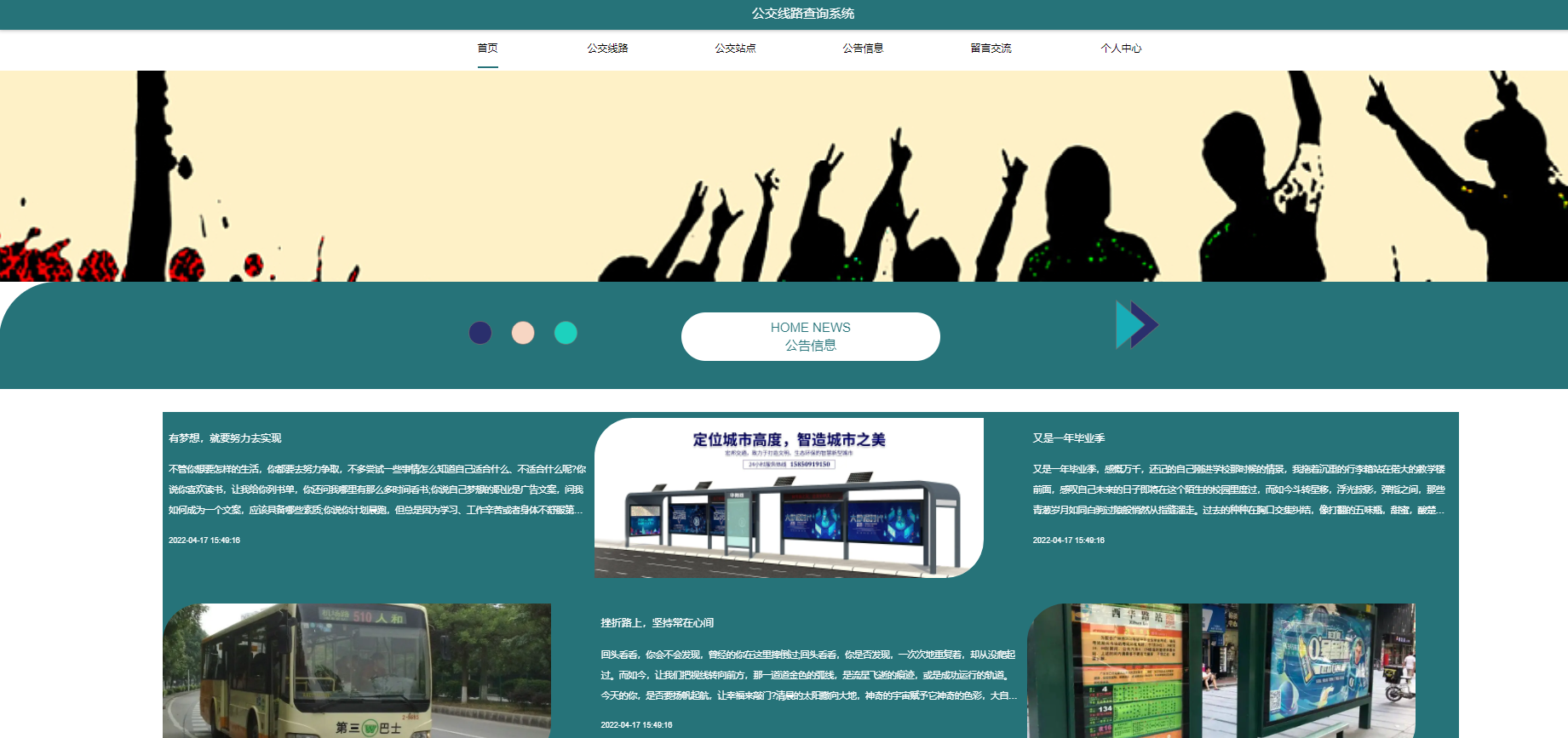 前台:首页、公交线路、公交站点、公告信息、留言交流、个人中心等