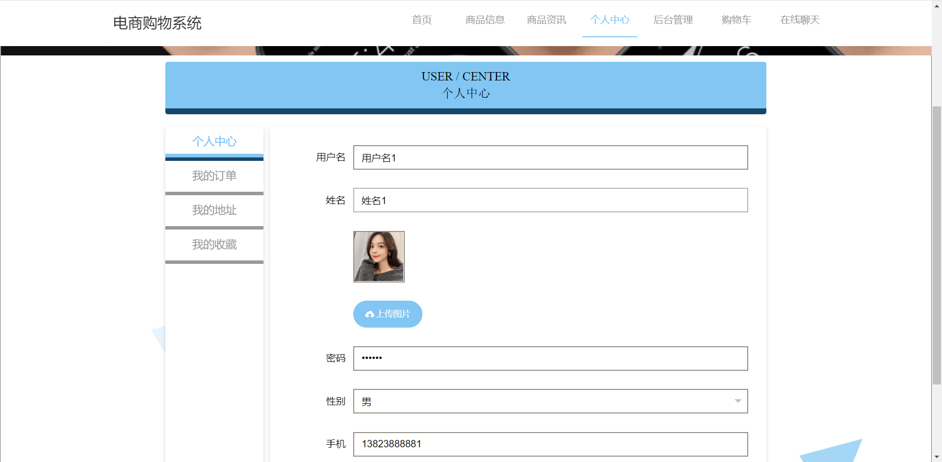 前台:首页,商品信息,商品资讯,个人中心,后台管理,购物车,在线聊天等
