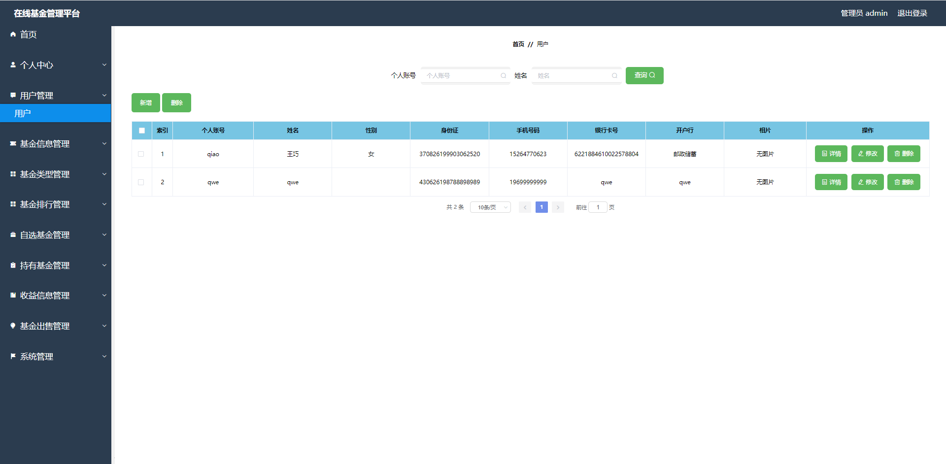 用户:首页,基金信息,基金排行,个人中心,后台管理等。 用户登录进入在线基金管理平台可以对首页,个人中心,自选基金管理,持有基金管理,收益信息管理等