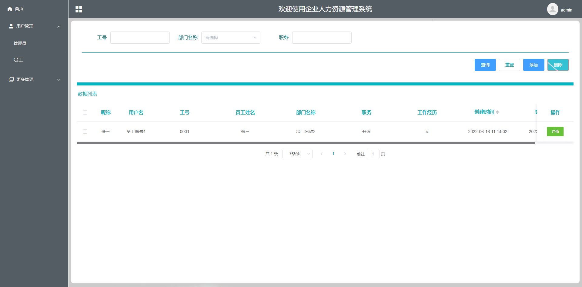 管理员:首页、用户管理、管理员、员工、更多管理、部门管理、 请假申请、人事考勤、公司绩效、奖惩信息、通知公告、员工工资等